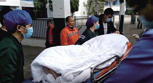 在江西信豐站臨時??績煞昼?,大家協(xié)力將產(chǎn)婦和新生兒抬到120急救車上,送往醫(yī)院進一步治療。(圖片由劉晶新提供)