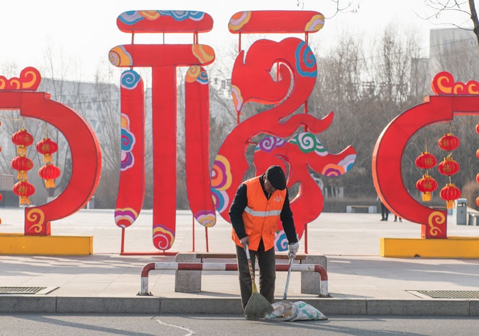 2月5日,正月初一,環(huán)衛(wèi)工人正在清掃街道。春節(jié)期間,呼和浩特市環(huán)衛(wèi)部門在全市特殊區(qū)域、重點(diǎn)路段、公共廁所等公共設(shè)施重點(diǎn)部位,加大環(huán)衛(wèi)力量投入,讓節(jié)日里的市容市貌更加亮麗。
