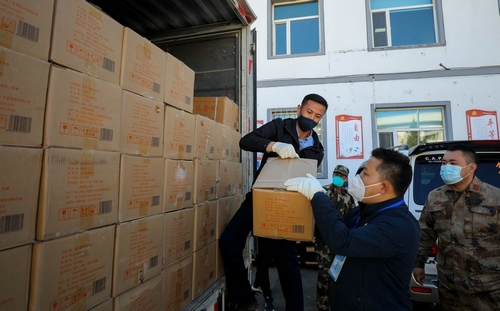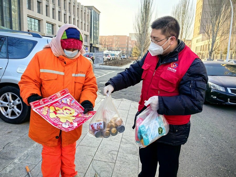 大家身穿志愿者馬甲,三五人一組結伴走上街頭,只要見到正在工作的環(huán)衛(wèi)工人,就會遞上一份節(jié)日暖心包,里面有臘八粥、小點心、春聯(lián)福字、兔年吉祥物裝飾卡片,還有酒精、口罩等防疫物資。