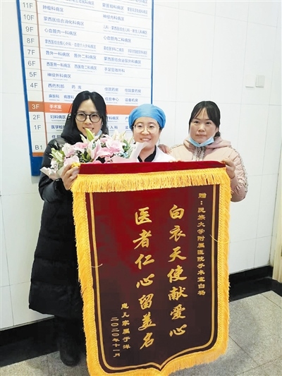 11月27日,當(dāng)孩子已經(jīng)好轉(zhuǎn)出院,王欣影沒(méi)有忘記那一夜遇到的好心人,她再一次撥通白楊的電話,此時(shí),她才得知白楊就是附屬醫(yī)院手術(shù)室的一名護(hù)士。她將一面寫(xiě)有“白衣天使獻(xiàn)愛(ài)心醫(yī)者仁心留美名”的錦旗送到了白楊的手中,她說(shuō):女兒又多了一位媽媽。白楊也向記者講起了那晚的經(jīng)歷,她說(shuō):“其實(shí),那晚我是去接我丈夫的,由于暴雪,丈夫被困在了米家科技園附近,我開(kāi)車去接他,在回來(lái)的路上,看到有車輛遇險(xiǎn),心想,這樣惡劣的天氣,遇到誰(shuí)有困難就應(yīng)該幫一把,當(dāng)時(shí),我們也沒(méi)有多想,我也是做母親的,看到夫妻倆那么焦急,我只想把孩子快點(diǎn)送到醫(yī)院,好在有驚無(wú)險(xiǎn),孩子平安無(wú)事?!焙髞?lái),記者還了解到,當(dāng)把孩子送到醫(yī)院后,白楊已渾身濕透,待孩子已經(jīng)搶救上,安頓好王欣影后,已經(jīng)是凌晨5點(diǎn),天也蒙蒙亮了,白楊沒(méi)有回家,一夜未眠的她,留在了工作崗位上。