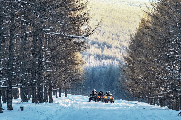 雪地摩托穿越森林雪野