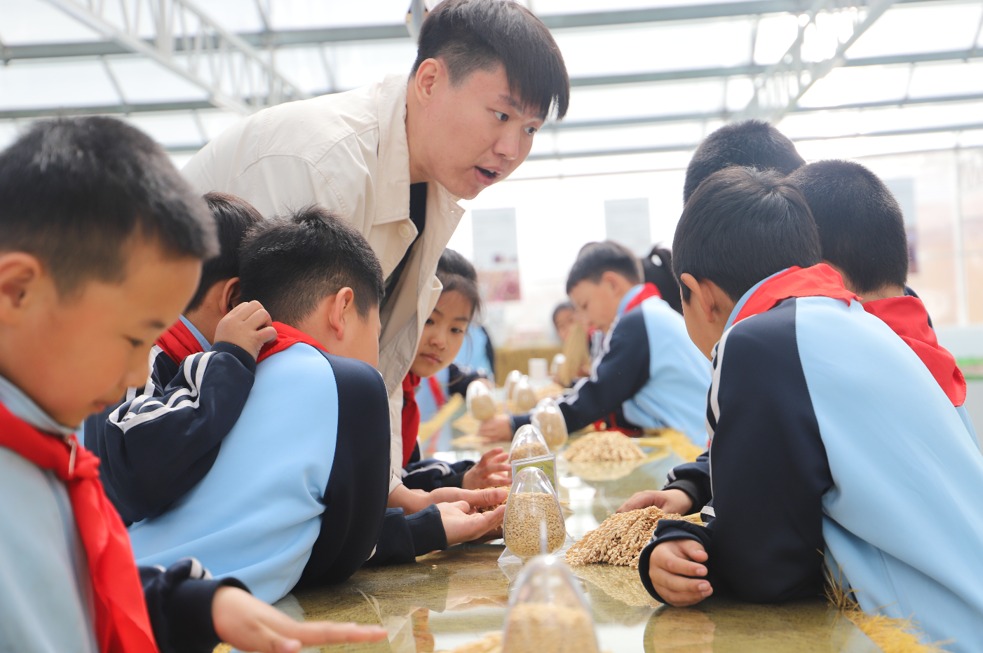 聆聽(tīng)講解員老師講述大米生長(zhǎng)過(guò)程