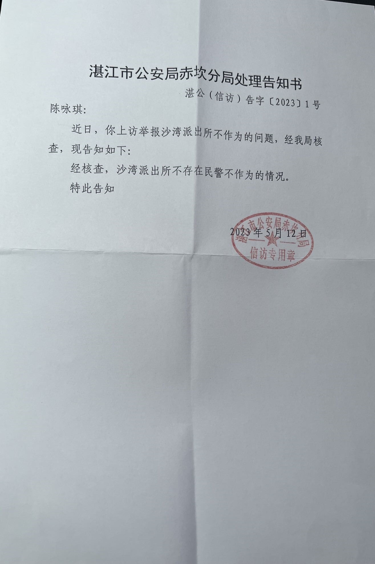 5月12日,湛江市公安局赤坎分局作出的《處理告知書》顯示,該公安分局表示,經(jīng)核查,沙灣派出所不存在民警不作為的情況。