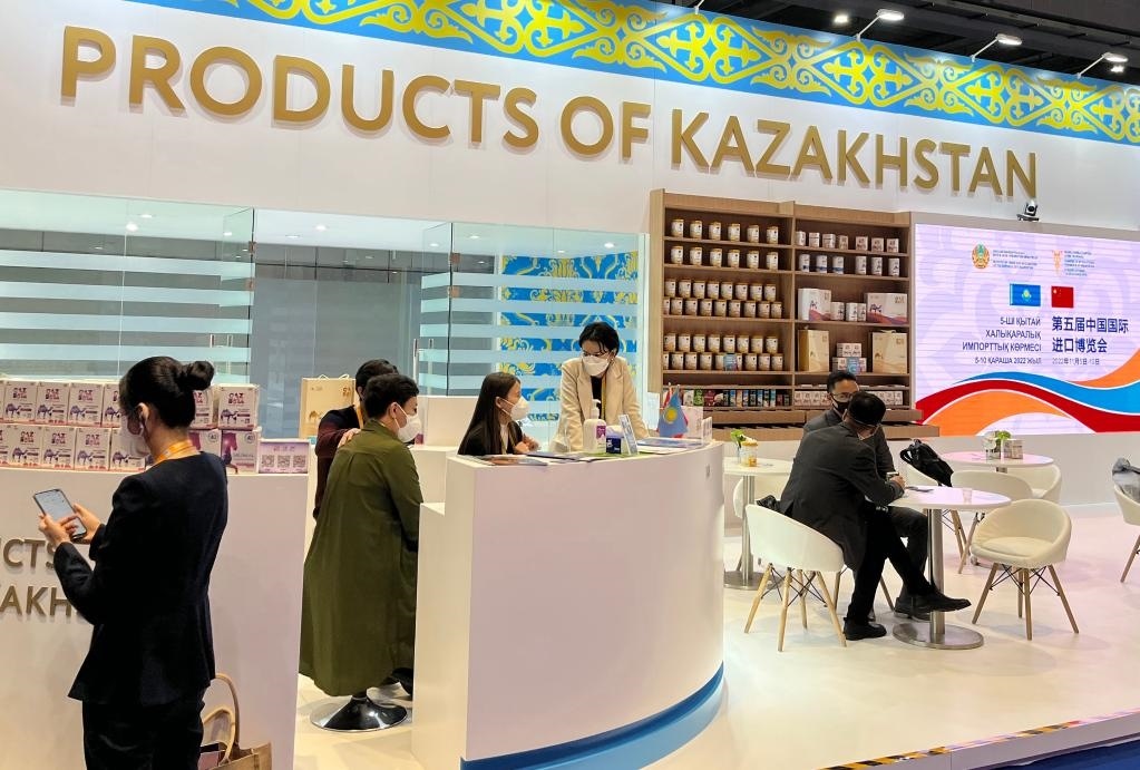 這是2022年11月6日在第五屆進(jìn)博會上拍攝的哈薩克斯坦產(chǎn)品展區(qū)。