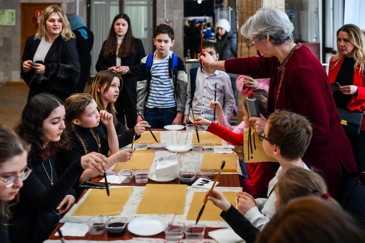 3月3日,在莫斯科國際關(guān)系學(xué)院,小朋友們?cè)谥袊幕w驗(yàn)活動(dòng)上學(xué)習(xí)使用毛筆。新華社記者曹陽攝