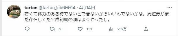 “只有年輕體力好的時(shí)候才能(這樣旅游),挺好的。在還有周游券的平成年代初期,我也這么干過(guò)?!?/p>