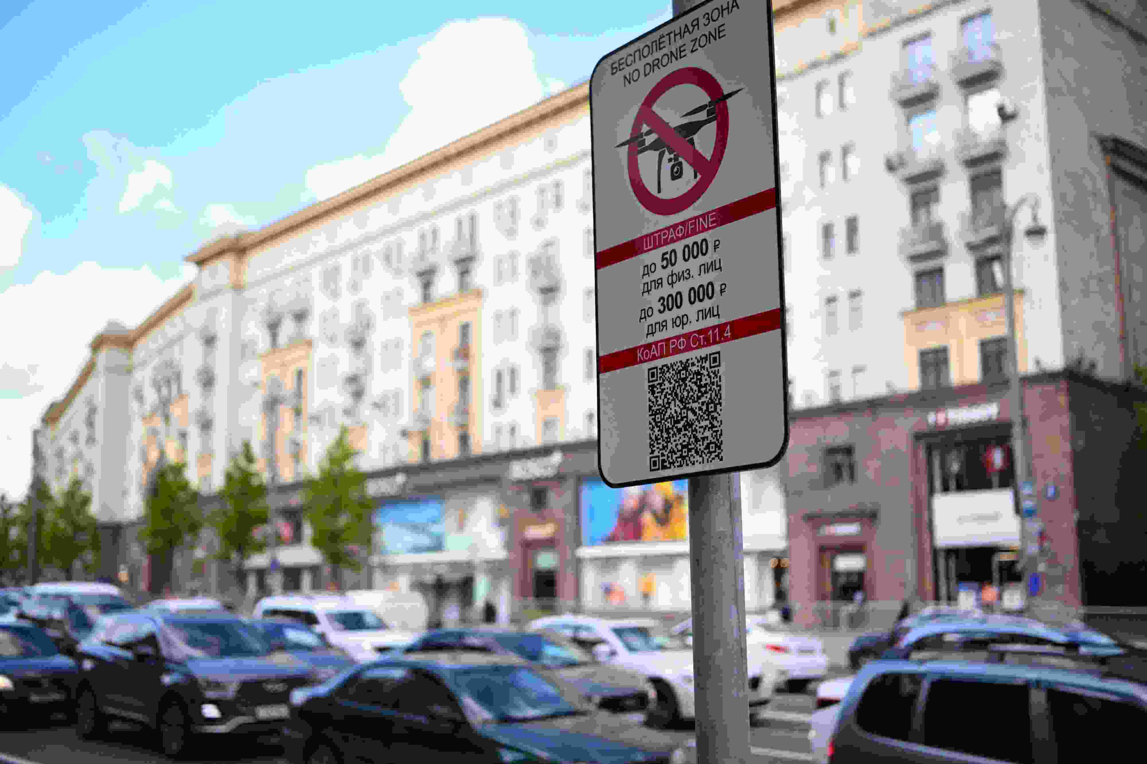 當(dāng)?shù)貢r間2023年5月3日,俄羅斯莫斯科,莫斯科市中心懸掛的“無人駕駛飛機(jī)禁飛區(qū)”的標(biāo)志,禁止無人機(jī)在該地區(qū)飛行??死锬妨謱m遭無人機(jī)襲擊后,莫斯科市長宣布禁止未經(jīng)授權(quán)的無人機(jī)在俄羅斯首都上空飛行。 視覺中國