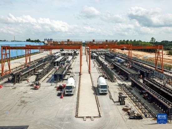 這是4月26日在馬來西亞吉蘭丹州拍攝的馬東鐵項(xiàng)目一分部制梁場(無人機(jī)拍攝)。新華社記者 朱煒 攝