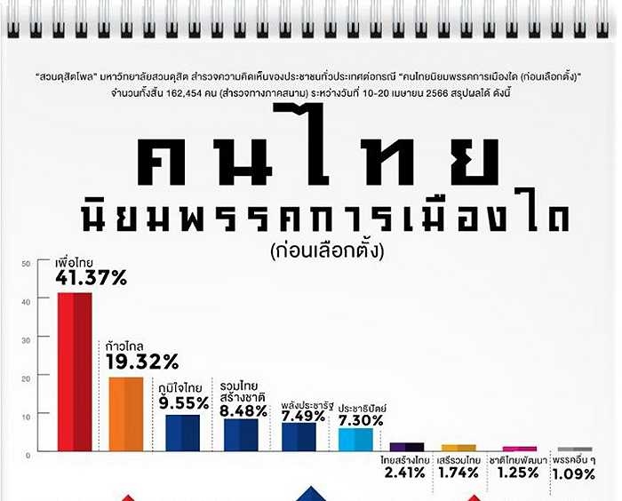 泰國川登喜大學(xué)民意調(diào)查研究機構(gòu)統(tǒng)計顯示,為泰黨在選民中的支持率為41.37%,遙遙領(lǐng)先于前進黨的19.32%和泰國人團結(jié)建國黨的8.48%。巴維所在的國民力量黨僅7.49%。