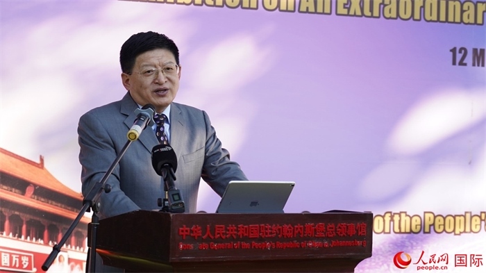 5月12日,中國駐約翰內(nèi)斯堡總領(lǐng)館在館內(nèi)舉辦新時代中國非凡十年成就圖片展,慶祝中南建交25周年。人民網(wǎng) 劉暢攝