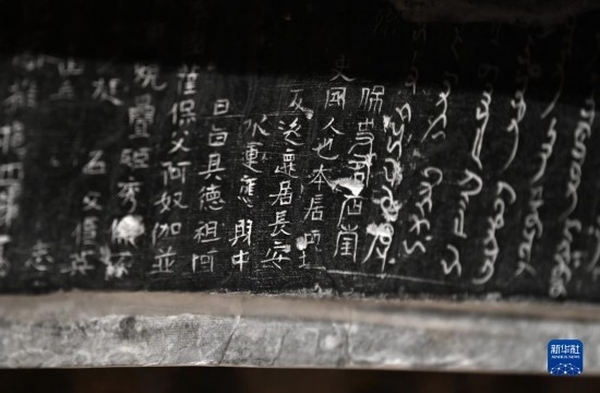 這是在西安博物院展出的史君墓石槨,槨門(mén)門(mén)楣上用漢文和粟特文刻著墓主墓志(5月8日攝)。墓主史君是北周涼州薩保,粟特人。石槨整體為中國(guó)傳統(tǒng)歇山頂?shù)钐檬浇ㄖ?,四壁浮雕?nèi)容和風(fēng)格則帶有鮮明的西域特色。