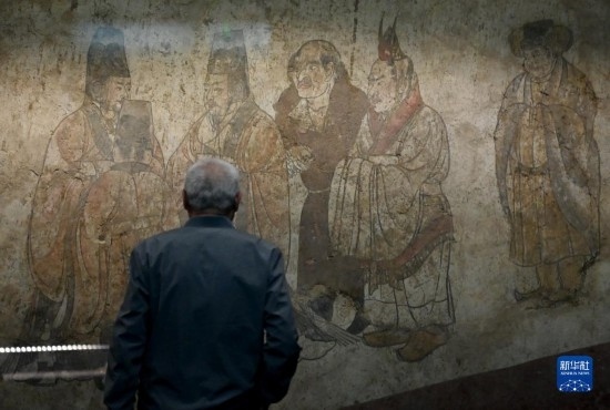 5月11日,游客在陜西歷史博物館內(nèi)觀(guān)看唐章懷太子墓《客使圖》?!犊褪箞D》描繪的是唐代外交機(jī)構(gòu)鴻臚寺官員接待外國(guó)使節(jié)的場(chǎng)景。