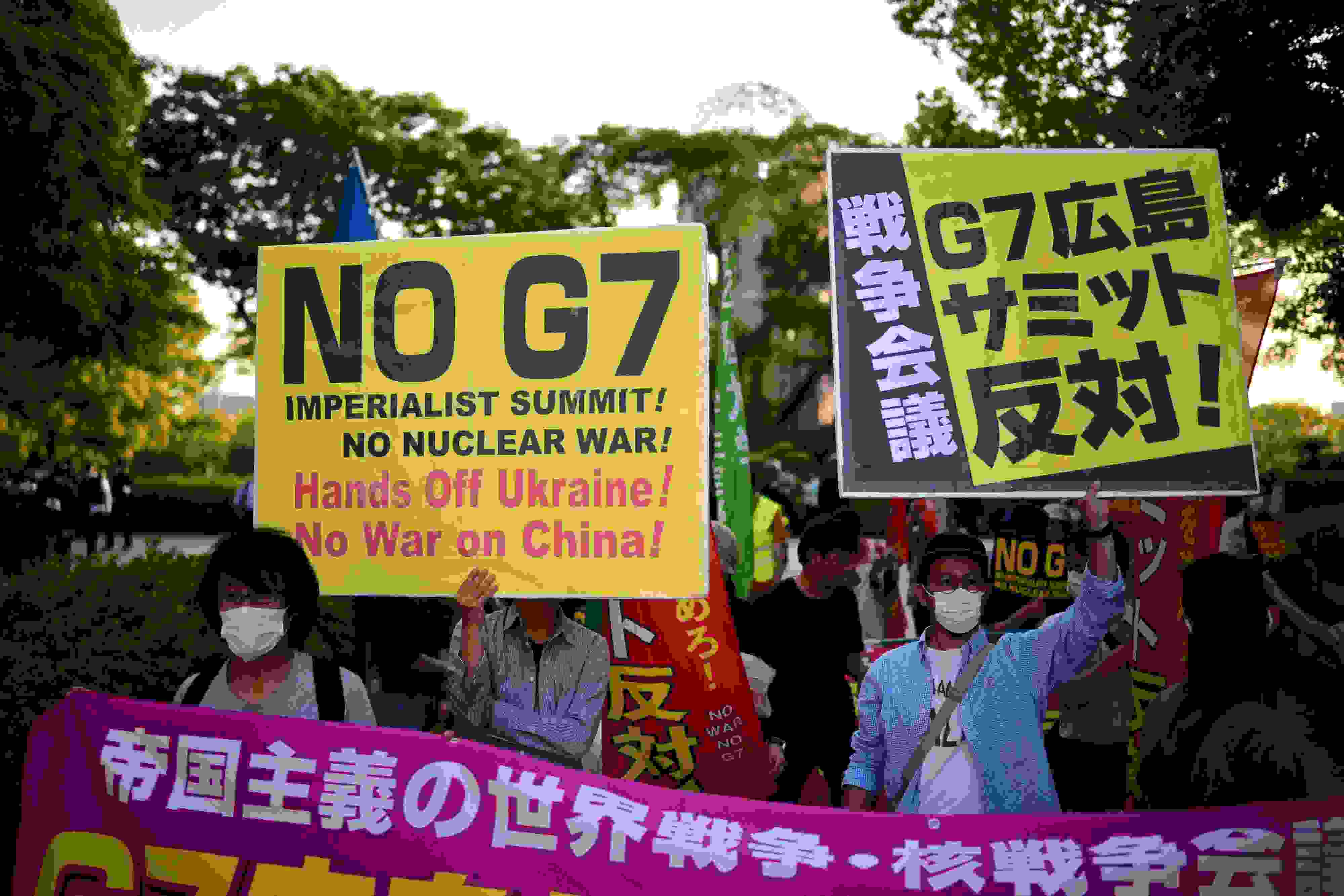 當(dāng)?shù)貢r間2023年5月17日,日本廣島,日本民眾舉著各式標(biāo)語,在廣島和平紀(jì)念公園原子彈轟炸遺址舉行集會,強烈抗議七國集團(G7)峰會將在廣島召開。 視覺中國