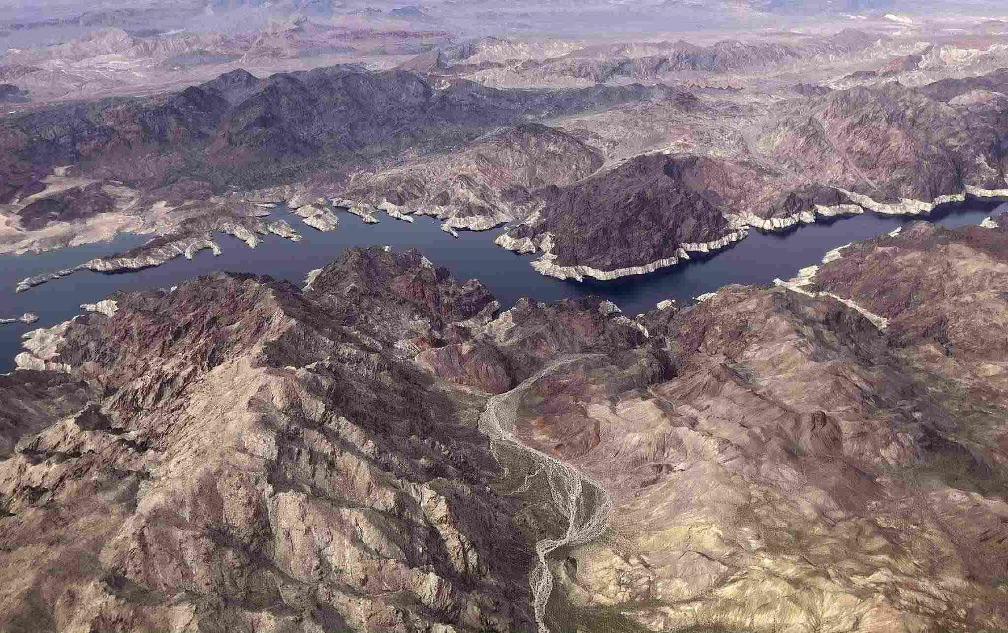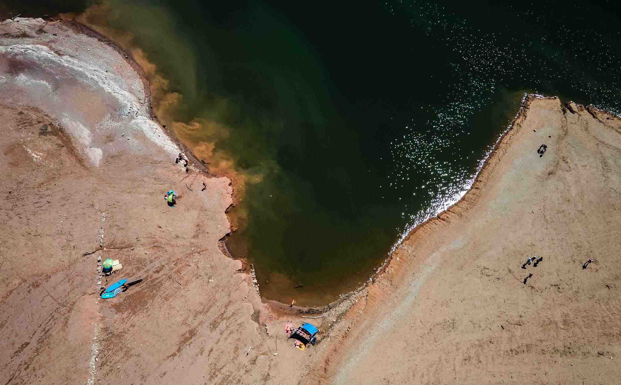 當(dāng)?shù)貢r(shí)間2023年4月16日,美國(guó)內(nèi)華達(dá)州,棕色的科羅拉多河流經(jīng)水位下降的米德湖。