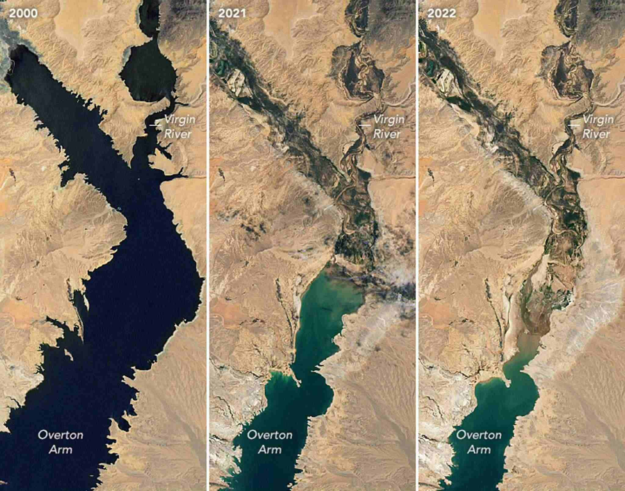 2000年-2022年衛(wèi)星拍攝的美國(guó)米德湖變化。