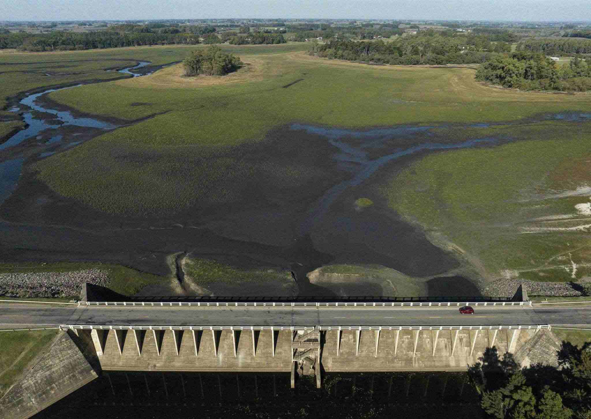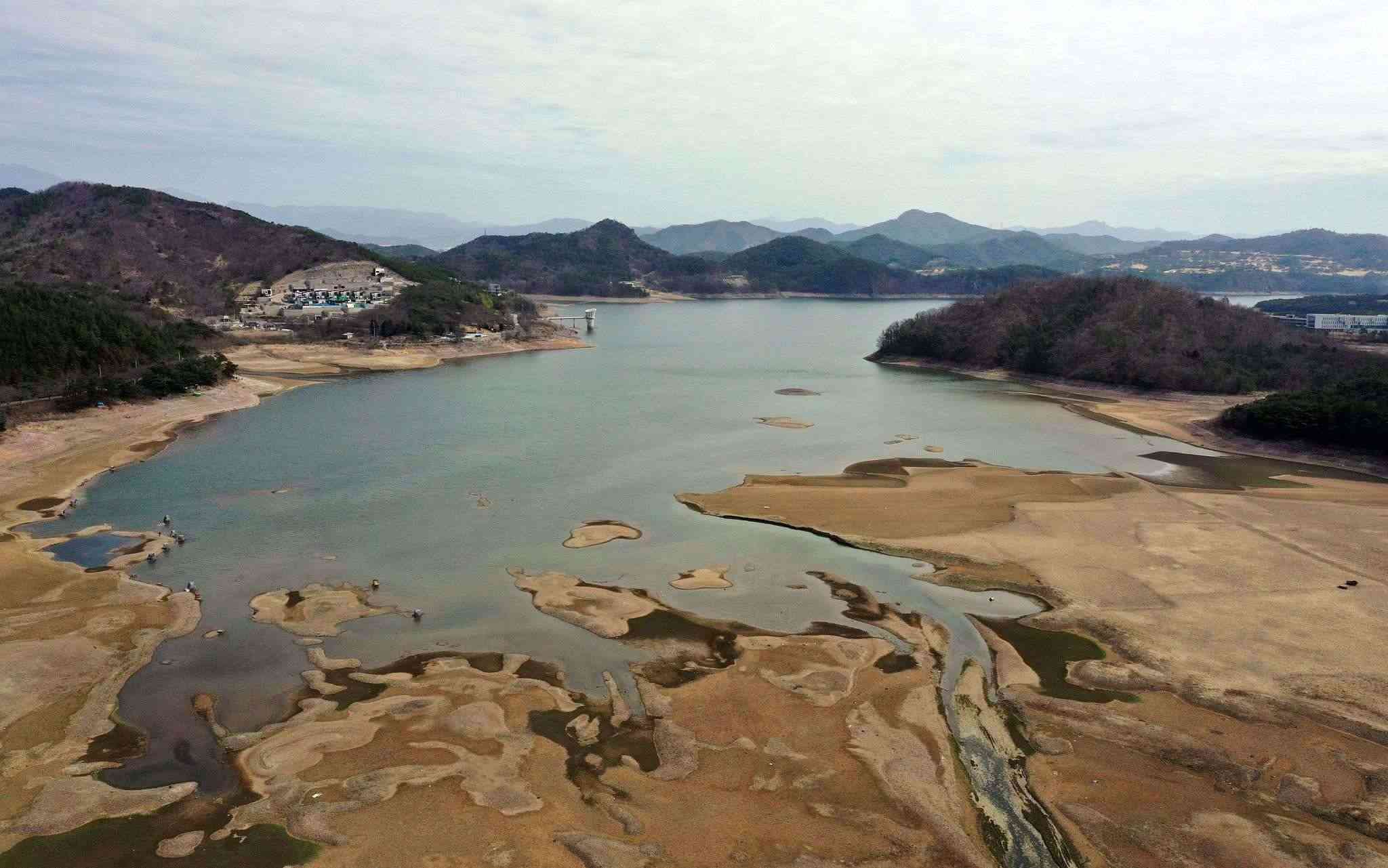 當(dāng)?shù)貢r(shí)間2023年3月21日,韓國(guó)羅州,羅州湖遭遇嚴(yán)重干旱,水量下降,河床裸露。
