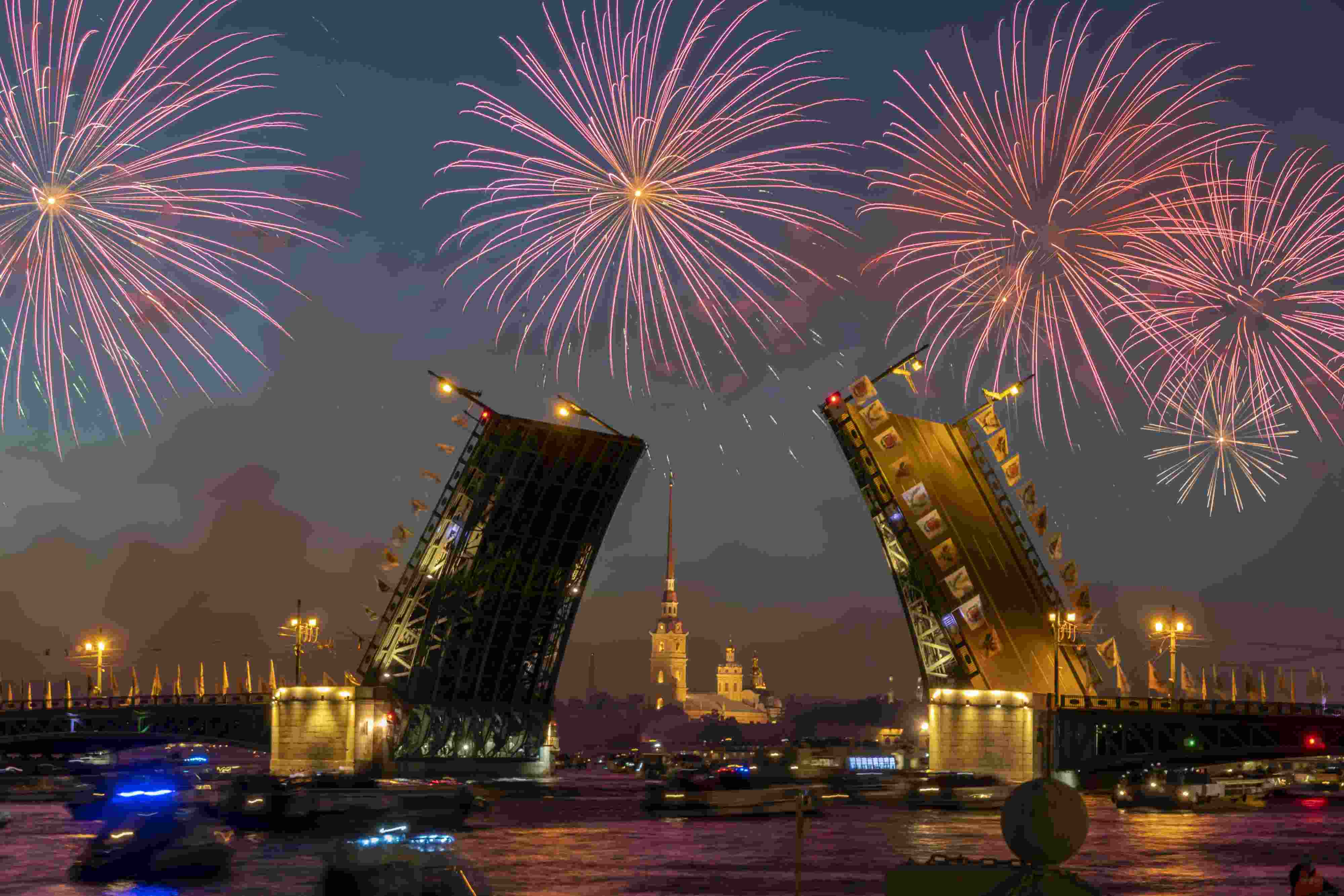 當(dāng)?shù)貢r(shí)間2023年5月28日,俄羅斯圣彼得堡燃放煙花慶祝建城320周年。 視覺中國(guó)