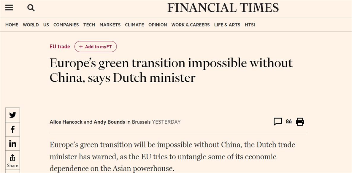 英國《金融時報》28日報道稱,荷蘭外貿與發(fā)展合作大臣施賴納馬赫爾警告稱,沒有中國,歐洲的綠色轉型將無法實現(xiàn)。