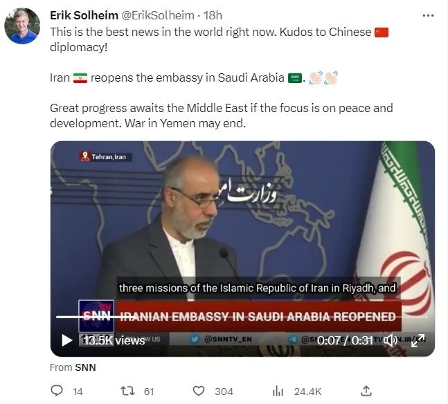 沙伊推進(jìn)復(fù)交 聯(lián)合國前高官稱贊中國外交! 當(dāng)?shù)貢r間3日,聯(lián)合國前副秘書長兼環(huán)境規(guī)劃署前執(zhí)行主......