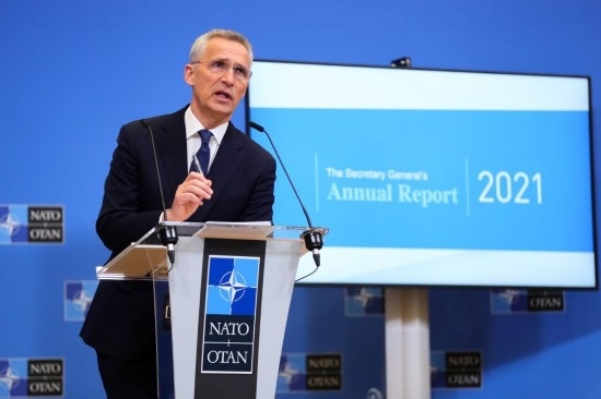 2022年3月31日,在比利時(shí)布魯塞爾,北約秘書長斯托爾滕貝格在新聞發(fā)布會(huì)上講話。新華社記者鄭煥松攝