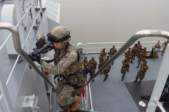 微山湖艦上,編隊(duì)特戰(zhàn)隊(duì)員向加方海軍陸戰(zhàn)隊(duì)員介紹了我特戰(zhàn)武器裝備,演示教授了滑降和艙室搜索等科目,并與加方海軍陸戰(zhàn)隊(duì)員進(jìn)行了反恐反海盜、武力營(yíng)救等專業(yè)交流。