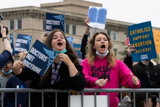 2022年5月3日,在美國(guó)華盛頓,支持和反對(duì)墮胎權(quán)的人們?cè)诿绹?guó)聯(lián)邦最高法院外集會(huì)。新華社發(fā)(亞倫攝)