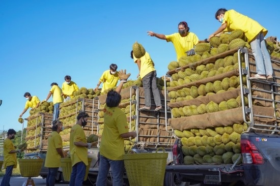 2021年5月30日,在重慶洪九果品股份有限公司位于泰國尖竹汶府的工廠內(nèi),工作人員在裝運即將銷往中國的榴蓮。新華社發(fā)