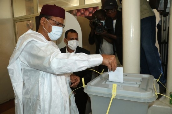 2021年2月21日,尼日爾爭取民主和社會主義黨候選人穆罕默德·巴祖姆(前)在尼亞美的一處投票站投票。新華社發(fā)