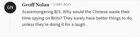 “危言聳聽(tīng)。中國(guó)人為什么要浪費(fèi)時(shí)間監(jiān)視英國(guó)人?他們肯定有更好的事情要做,除非他們這么做是為了搞笑。”