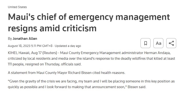 路透社8月18日報道,毛伊縣緊急事務(wù)管理機構(gòu)負(fù)責(zé)人赫爾曼·安達(dá)亞在當(dāng)?shù)鼐用窈兔襟w的一片“救災(zāi)不利”的譴責(zé)聲中辭職。截至17日,致命山火已經(jīng)造成至少111人死亡。一些毛伊島居民認(rèn)為,如果能更早拉響警報,會挽救更多生命。