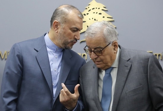 10月13日,伊朗外長阿卜杜拉希揚(yáng)(左)和黎巴嫩外長哈比卜在黎巴嫩首都貝魯特出席記者會(huì)。新華社記者劉宗亞攝