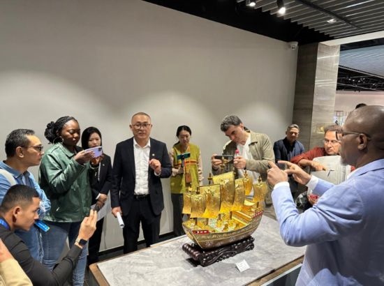 嘉賓展示景泰藍作品“柿柿如意” (新華社記者王艷剛攝)