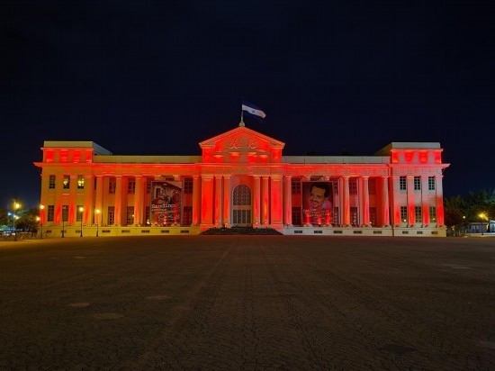 2022年1月31日,尼加拉瓜首都馬那瓜市中心標(biāo)志性建筑國家宮點(diǎn)亮“中國紅”。新華社發(fā)(中國駐尼加拉瓜使館供圖)