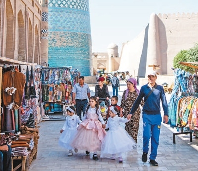 9月21日,人們?cè)跒跗潉e克斯坦花剌子模州的希瓦古城游覽。新華社記者 鄔惠我攝