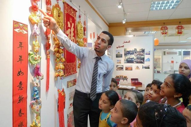 一位埃及青年正認(rèn)真向圍在身邊的學(xué)生們講解中國(guó)傳統(tǒng)文化中的十二生肖。他身穿白色襯衫,系著條紋領(lǐng)帶,學(xué)生們仰起頭,專(zhuān)心致志地聆聽(tīng)講解。這位埃及青年便是時(shí)年28歲的阿巴斯。作為開(kāi)羅中國(guó)文化中心主任助理,他經(jīng)常在這里向埃及學(xué)生和民眾介紹中國(guó)的文房四寶和京劇臉譜,講解中國(guó)的傳統(tǒng)節(jié)日和風(fēng)景名勝,并帶領(lǐng)孩子們做手工,燈籠、風(fēng)箏和寫(xiě)對(duì)聯(lián)往往是他們最喜愛(ài)的內(nèi)容。在當(dāng)年埃及的動(dòng)蕩時(shí)局下,中國(guó)文化中心照常對(duì)外開(kāi)放,各種活動(dòng)有序開(kāi)展。首屆大使杯“魅力埃及,多彩中國(guó)”攝影大賽作品展就吸引了上百名開(kāi)羅市民前往參觀(guān)。