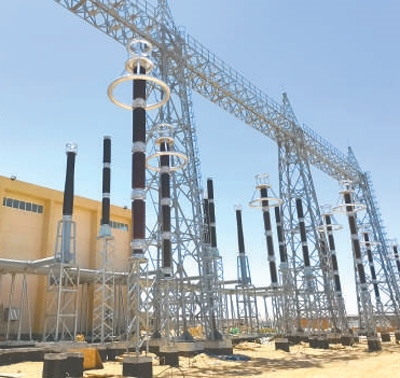 位于蘇伊士省的??怂_迪亞500千伏變電站項目現(xiàn)場,鐵塔高聳,一條條高壓輸電導線接入變電站設備,電流通過導線時發(fā)出嗡嗡聲。