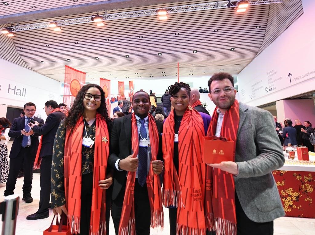 1月16日,在瑞士達(dá)沃斯,與會(huì)者在“大連之夜”招待會(huì)上合影。新華社記者連漪攝