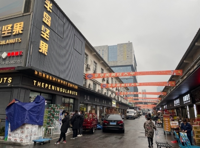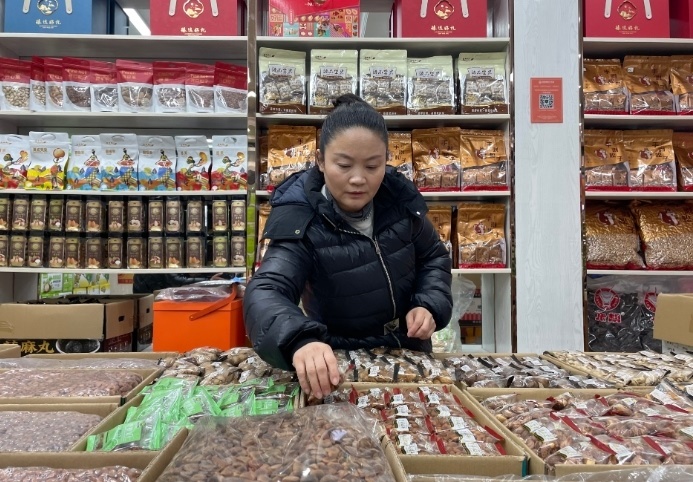 這是湖南長沙高橋大市場(chǎng)堅(jiān)果經(jīng)銷商李海麗在整理貨物。新華社記者 余春生 攝