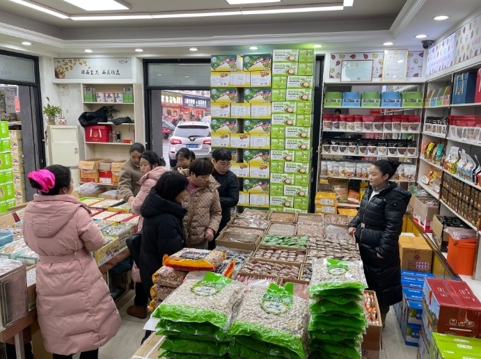 這是湖南長沙高橋大市場(chǎng)堅(jiān)果經(jīng)銷商李海麗(右一)在向顧客介紹非洲堅(jiān)果。新華社記者 余春生 攝