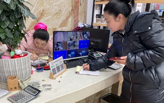 這是湖南長沙高橋大市場(chǎng)堅(jiān)果經(jīng)銷商李海麗(右一)在聯(lián)系物流。新華社記者 余春生 攝