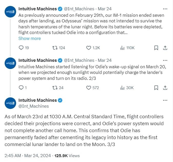 “經(jīng)過數(shù)天等待,已確認(rèn)‘奧德修斯’電力系統(tǒng)已不能支持它再次完成通信,”聲明寫道。“這證實(shí)‘奧德修斯’作為首個(gè)由私營企業(yè)發(fā)射的月球著陸器永久休眠?!?/p>