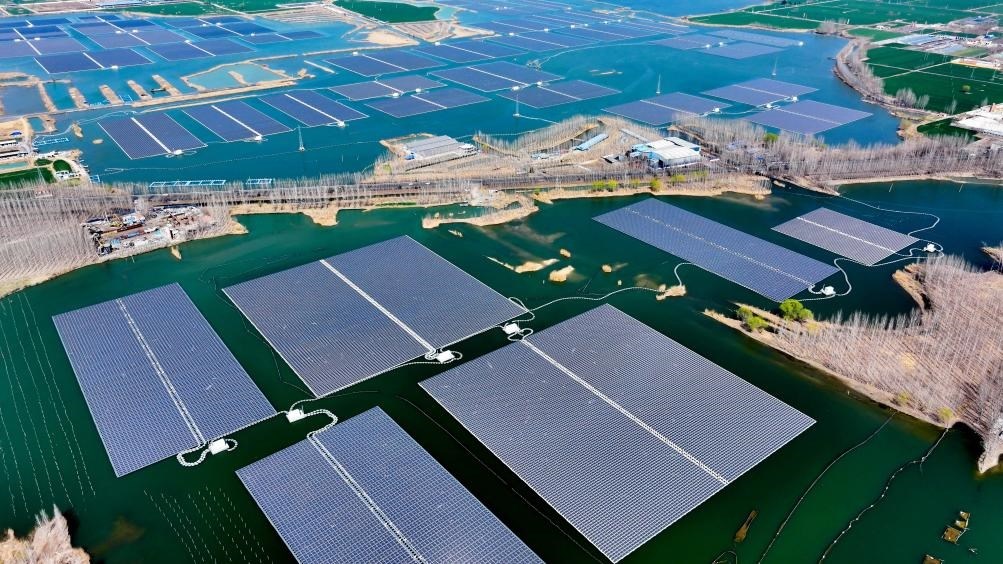 ?這是山東省濟(jì)寧市微山縣驩城鎮(zhèn)利用采煤塌陷區(qū)約3600畝水面建設(shè)的漁光互補(bǔ)項(xiàng)目(2024年3月20日攝,無人機(jī)照片)。該項(xiàng)目集光伏發(fā)電、漁業(yè)養(yǎng)殖、生態(tài)修復(fù)于一體。新華社記者郭緒雷攝