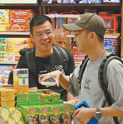 在泰國曼谷素萬那普機場免稅店,兩名中國游客正在購買當地特色產品。