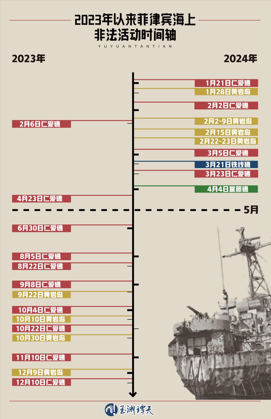 這是2023年以來,菲律賓在南海挑釁滋事的時間線,可以看到,在防務準則更新后,菲律賓在南海挑釁滋事的頻次驟增。