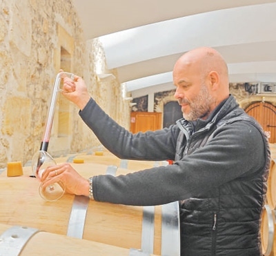 法國大酒窖集團(tuán)波爾多分公司首席釀酒師和技術(shù)總監(jiān)文森·卡紹在酒窖取酒品嘗。本報記者 邢 雪攝