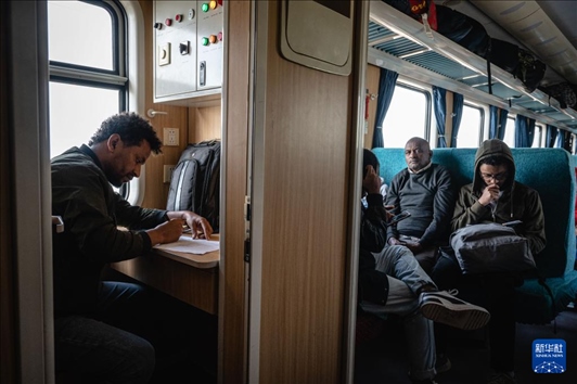 2023年9月9日,列車員在亞吉鐵路列車的車廂內(nèi)查票。新華社記者 王冠森 攝