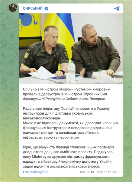 5月27日,烏克蘭武裝部隊總司令亞歷山大·瑟爾斯基(Oleksandr Syrskyi)在Telegram平臺上發(fā)文,稱法國有意向烏克蘭派遣教官,培訓烏軍人員,并表示已簽署相關文件,允許首批法國教官訪問烏軍培訓中心。
