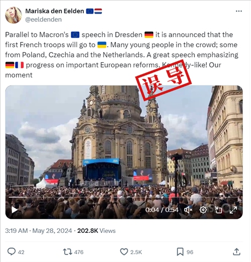- 馬克龍在德累斯頓演講期間,未曾表示將向烏克蘭派遣軍隊,網傳說法不實。