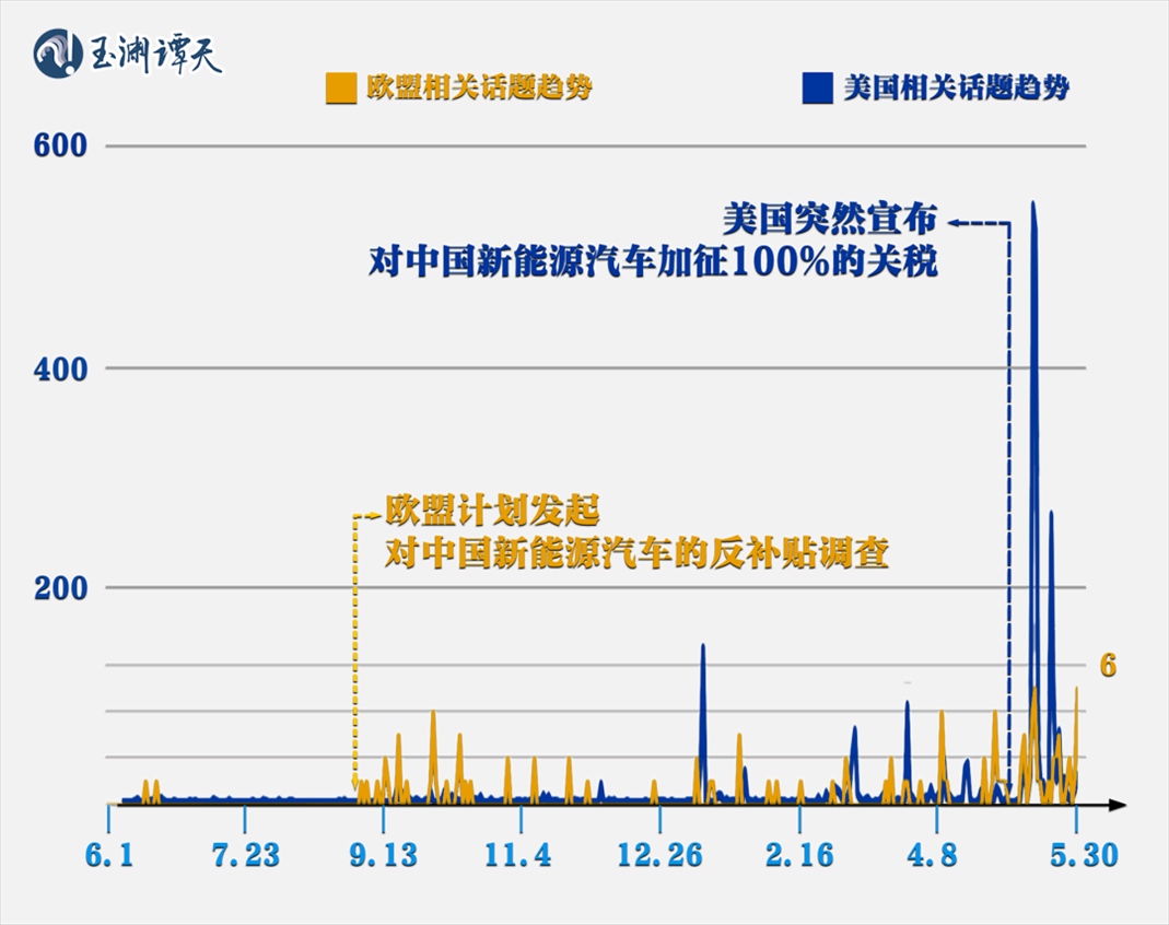 譚主分地區(qū)集納了過去一年外媒關(guān)于“對(duì)中國(guó)新能源汽車加征關(guān)稅”的報(bào)道,發(fā)現(xiàn)美國(guó)和歐洲地區(qū)出現(xiàn)了明顯的錯(cuò)峰: