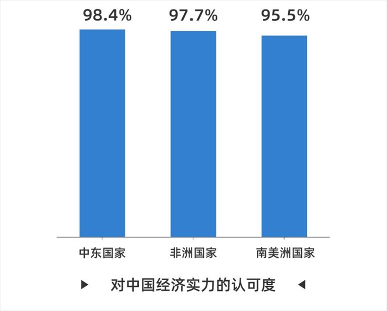 在經(jīng)濟(jì)表現(xiàn)方面,92.3%的受訪者稱(chēng)贊中國(guó)經(jīng)濟(jì)實(shí)力強(qiáng)勁,這一調(diào)查結(jié)果與去年基本持平。其中,中東國(guó)家受訪者的認(rèn)可度達(dá)到98.4%,非洲國(guó)家和南美洲國(guó)家受訪者的認(rèn)同度分別為97.7%和95.5%。